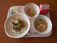 肉味噌丼 牛乳 じゃが餅スープ チャプチェ バナナ