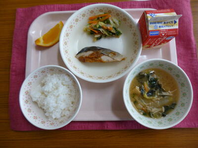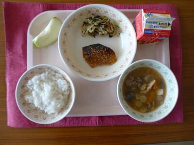 【献立】ご飯 牛乳 鯖のごま味噌焼き キャベツの磯か和え 豚汁 りんご