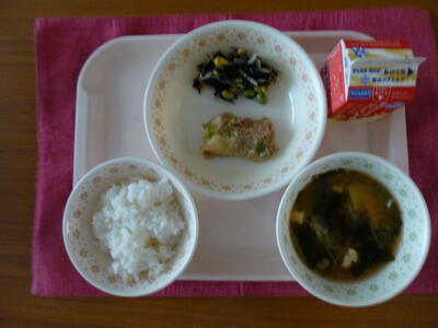 ごはん 牛乳 鶏のねぎ塩焼き ひじきと枝豆のサラダ 豆腐とわかめのみそ汁