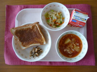 【献立】 きなこトースト 牛乳 ABCスープ まめまめサラダ 小魚ごまアーモンド