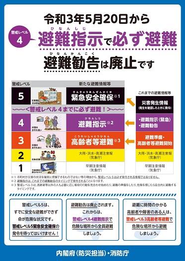 災害発生時、警戒レベル4での発令が「避難勧告」から「避難指示」に変更となりました。