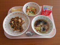 麻婆丼 牛乳 カシューナッツサラダ 中華サラダ りんご