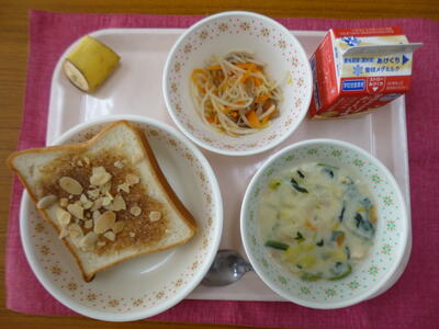 12月8日(月)のランチタイム 投稿日時 : 12/08 川間小学校管理者 カテゴリ: 【献立】 アーモンドトースト 牛乳 米粉シチュー 蒟蒻サラダ バナナ 米粉のシチューは米粉のおかげでとろっとなめらか。 野菜の甘みがたっぷりと感じられました。