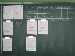 5年生の算数では、多角形の角の和の求め方について、考えを出し合っていました。多角形の中にかくれている三角形にヒントがあるようです。