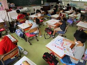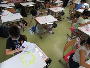 1年生の図工では、はじめて絵の具を使って画用紙にのびのびと線を描いていました。いくつもの線を描いているうちに、筆の使い方にも慣れてきたようです。
