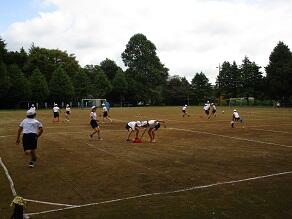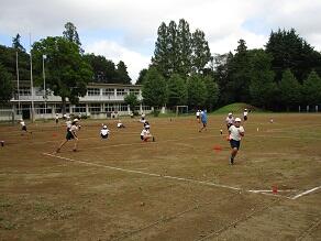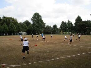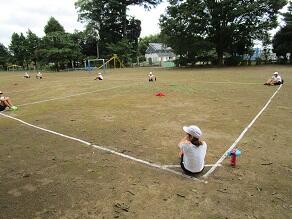 6年生の体育では、正方形の枠の中心に置かれたお手玉を、より多く取り合うゲームをしていました。
