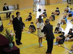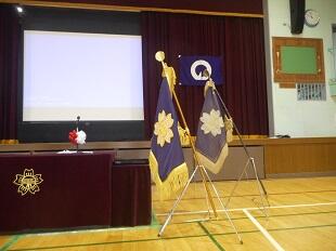 PTAより、校旗を新調していただきました。また、児童には記念パンフレット・クリアファイル・記念タオルが贈られました。