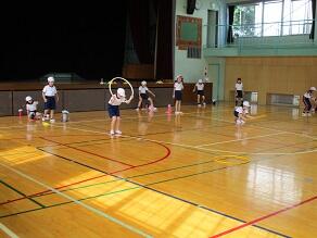 4年生の体育では、フラフープを使ったゲームで汗を流していました。