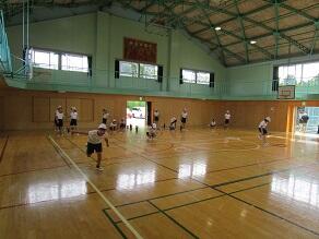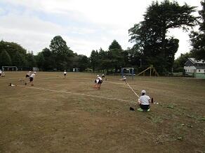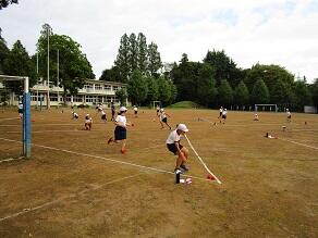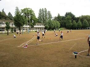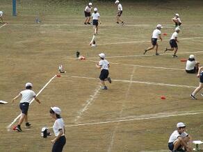 6年生の体育では、前時の正方形から正三角形に枠の形を変えて、お手玉取りをしていました。お手玉を取りに行っている間に、せっかく自分が持ってきたお手玉をとられてしまうので、よく作戦を考えて競い合っていました。