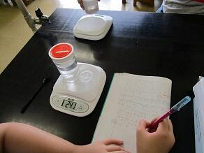 5年生の理科では、水に食塩を溶かすと水の重さはどうなるかを調べていました。予想では、「重くなる」「変わらない」が半々でしたが・・・。
