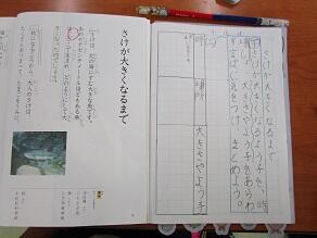 2年生の国語では、さけ(鮭)は、いつ頃、どこで、どれくらい大きくなるのかを、表を使ってまとめています。