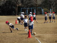1年 体育では、ベースボール型のボール運動を行っていました。チーム競技なので、友達と力を合わせて頑張っていました。