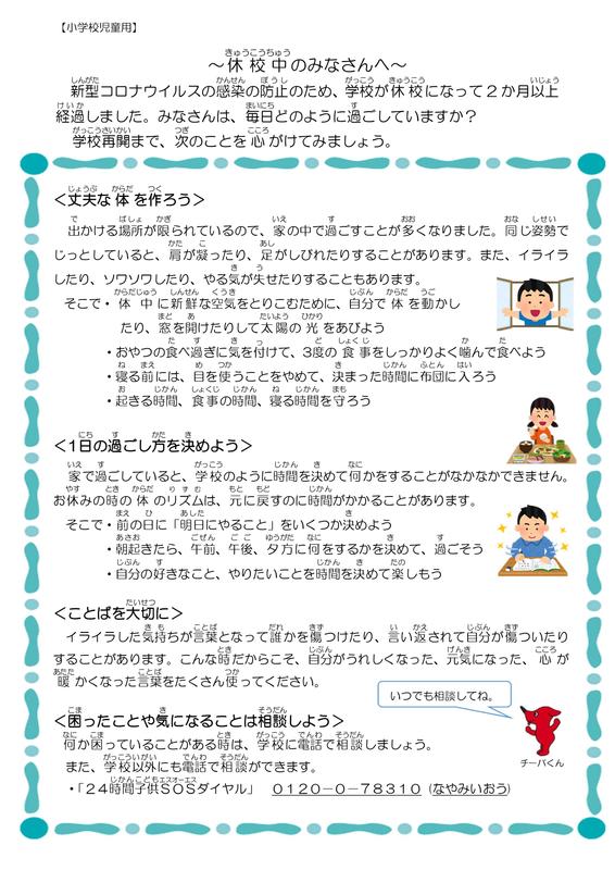 千葉県教育委員会より、休校中の児童の心のケアについてのリーフレットが届きました。リーフレットを活用して、休業期間中の生活を見直してみましょう。