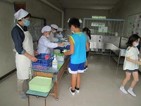 給食の準備の様子です。こちらも「密」にならないよう、衛生面に気をつけながら行っています。おかわりは、各学級担任が配ります。