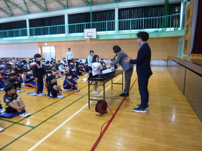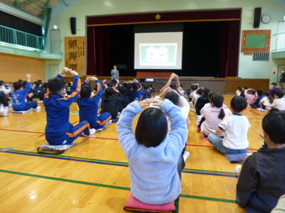 全校朝会では、水道ポスターの表彰やかわまハートのお話がありました。