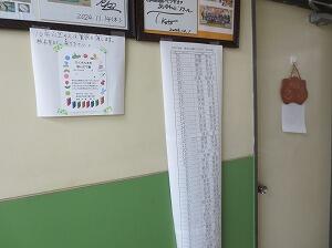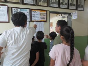 校長室前に掲示 76冊から5冊までの児童 結果を見る児童の様子