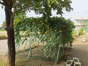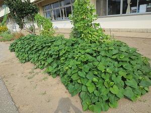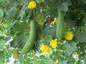 ヘチマのカーテンができています 実も立派 サツマイモの葉もふさふさです