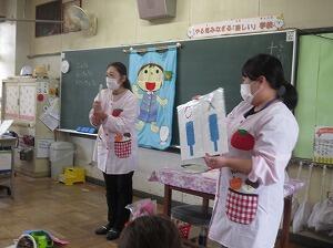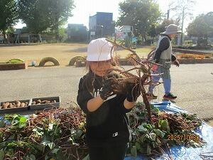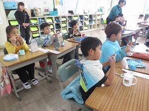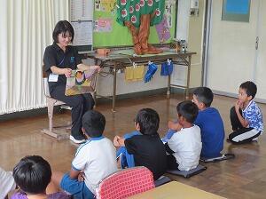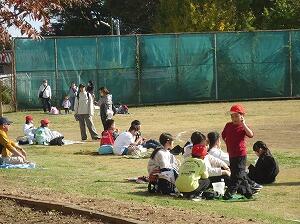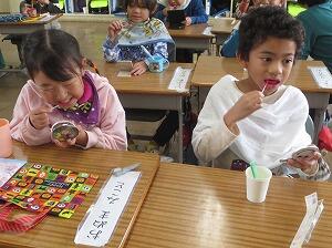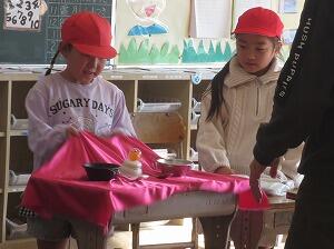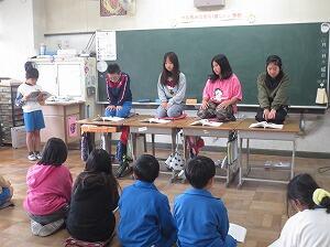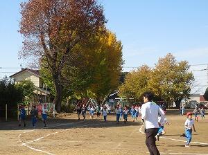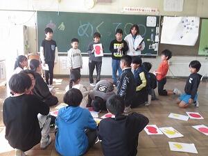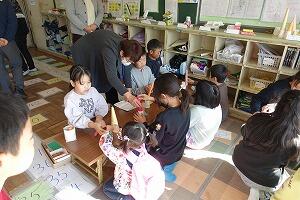 11月26日に木間ケ保育所と1年生との交流会が、本校で行われました。ぽかぽかの良い天気でしたので、校庭でも落ち葉や木の実探しを行いました。実際に1年生の教室で、保育所のお友達はお弁当でしたが、一緒にお昼も食べました。1年生も、お兄さん、お姉さんになりはりきって、案内していました。