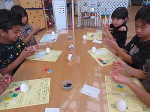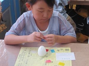 卵形のキャンドルに挑戦 5枚のロウのシートを選びます 説明も真剣に聞いています