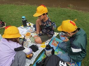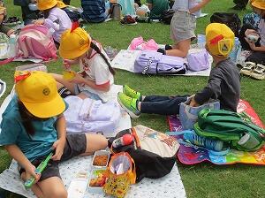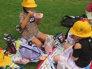 まずは腹ごしらえです 芝生の上で買ったものを食べています