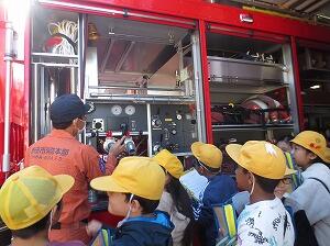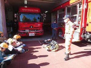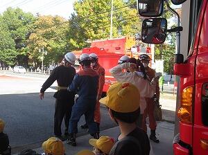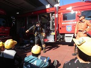 消防車の説明 防火服を40秒ぐらいで着ることができました 機器もたくさん付いています