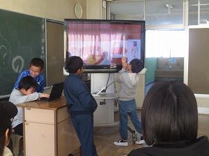 画像を見せながら児童会が説明しています。(木間ケ瀬ラジオ)