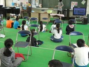 4年生は音楽室でこきりこ節のDVDを視聴中 5年生は体育館で2人組で倒立練習中