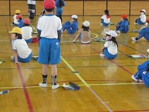 4年生。なわとびについて相談中? 5年生はティーボールをしていました