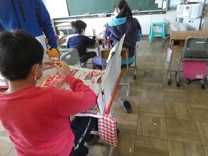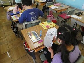 2年生。以前から作っていた紙細工ができていました 3年生は本日配られた文書を先生が読んでいました
