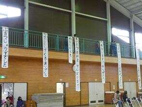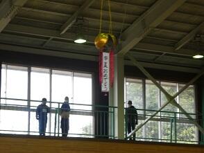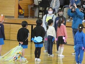 1年生は体育館で生活科で作った「かざわ」を走らせていました。風を与えて前に進めていました