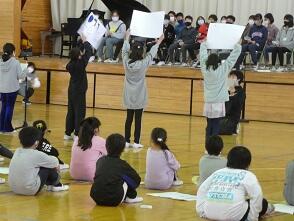3月9日(火)、朝の時間を使い明るい選挙書き初め展、県書き初め展、東葛飾家庭科作品展の表彰をしました。昼休みには、吹奏楽部のお別れコンサートが行われました。例年と異なり楽器を使うことができませんでしたが、全校児童のほぼ全員が体育館に集まり吹奏楽部のボディーパーカッションを見ました。6年生の言葉の中に、市内音楽会の思い出が多くありました。また3年生4年生5年生と一緒に作り上げられたことが楽しかったという言葉が印象的でしたまた。