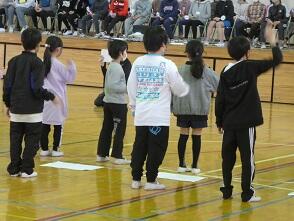 上級生の後をまねしながらついて行きます こちらは体育館でのミニバスケットボール部
