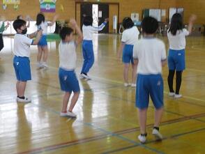 5年生と6年生は体育館で縄跳びをしていました。これは5年生の様子。頑張って跳んでいます