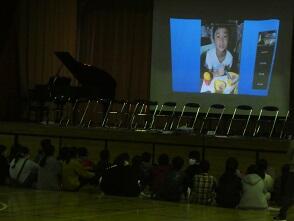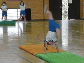 4年生は音楽室でこきりこ節のDVDを視聴中 5年生は体育館で2人組で倒立練習中