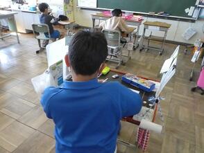 5年生は電気の学習でした。車を作り実際に走らせていました。電池の向きを逆にする人はいませんでした。