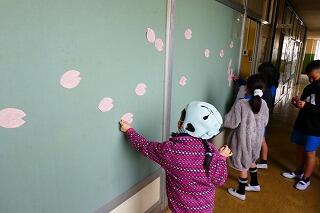 2年生は廊下に桜の花びらを散らせていました。