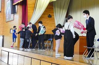 代表児童からの花束の贈呈、最後の校歌斉唱。