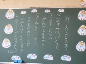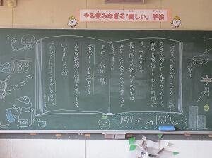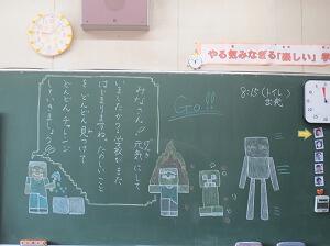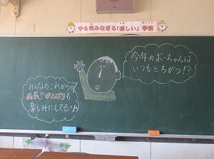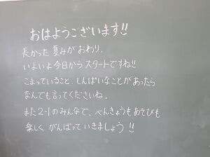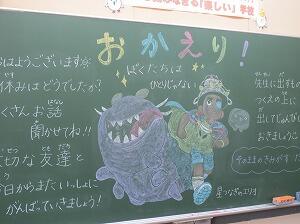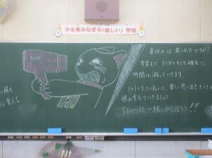 【番外編】 本日(9月1日)、各クラスでは、教室に入った際に目に入る黒板に、担任の先生がそれぞれの思いを書いて(描いて)児童を迎えます。どのクラスかはご想像ですが、一部紹介します。
