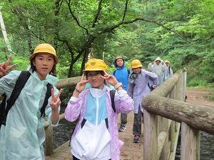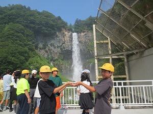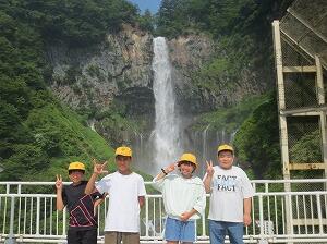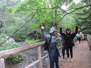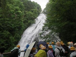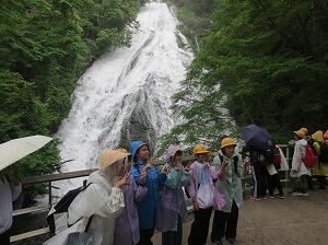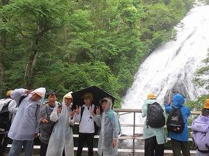 雨のせいか湯滝の勢いもすごかった みんな達成感の笑顔