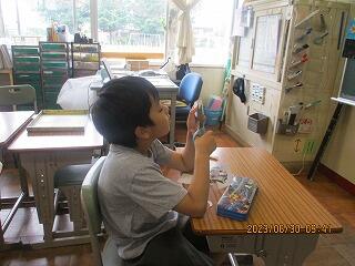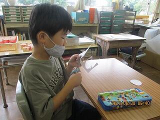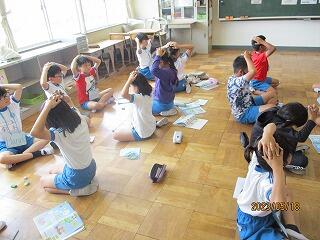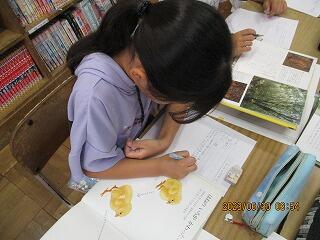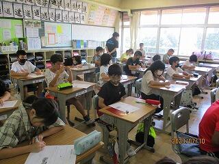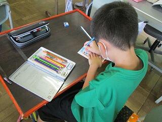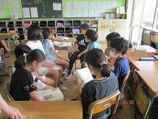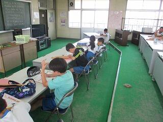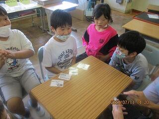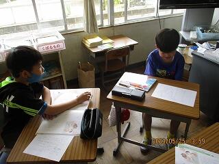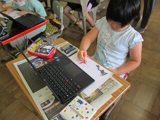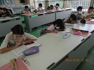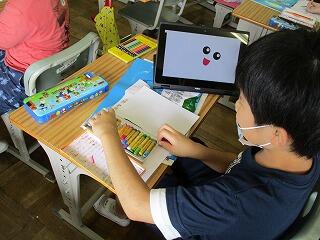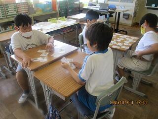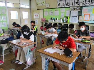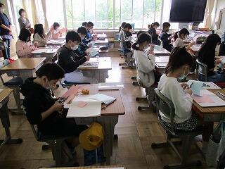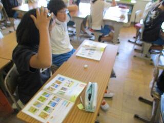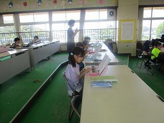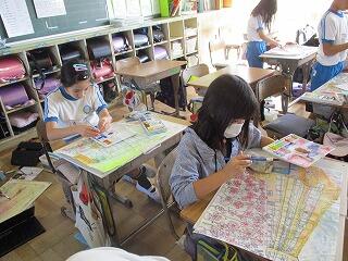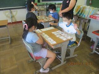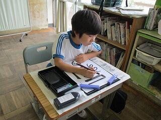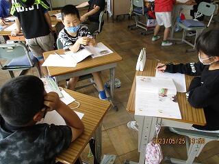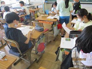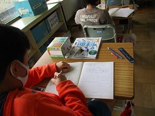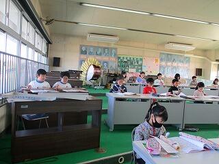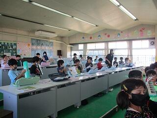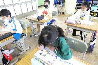 眼科検診のため、検診が終わった児童から教科書についている歴史カルタをしたり、eライブラリーをしたり、お絵かきをしたりして静かに過ごしました。