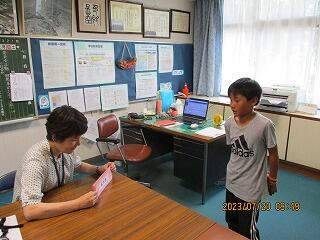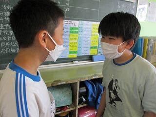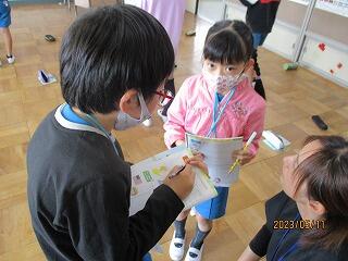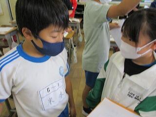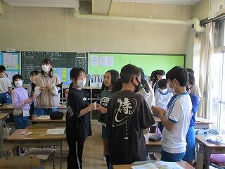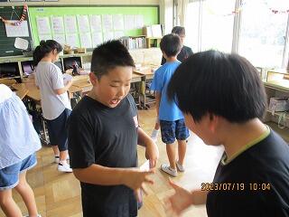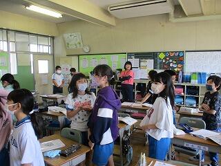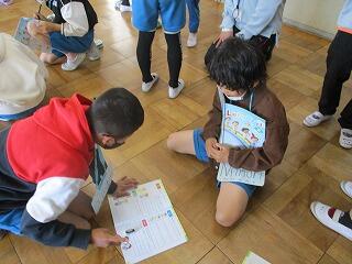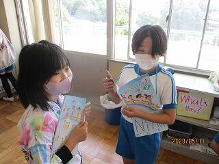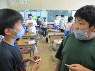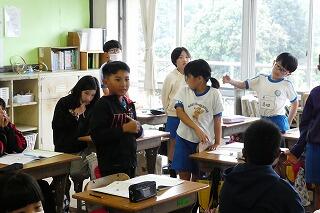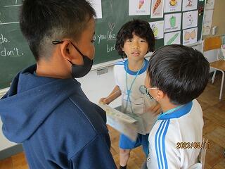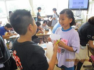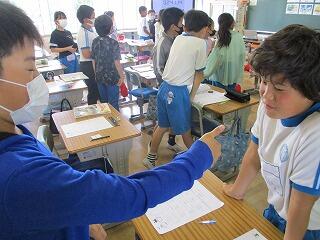 全体やペアで練習をした後、5分間でたくさんの人と尋ね合う活動では、相手の目を見て話そうと頑張っている姿がみられました。