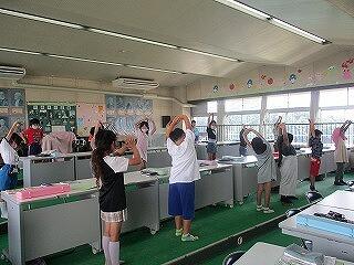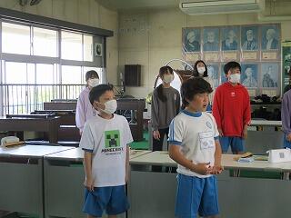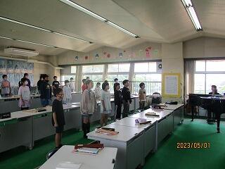 3年生の音楽では、ウォーミングアップの発声と校歌を練習している様子です。
