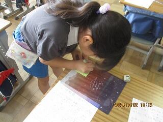 いろいろな模様を彫っては、紙に押して楽しみました。