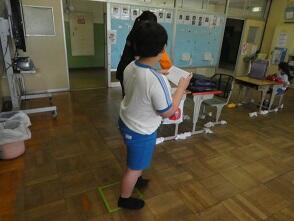 今日は、2年生と3年生が発育測定を行いました。身長と体重を測ります。新型コロナ対策として、一人終わるごとに職員が器具の消毒をしています。1年生は、教室で朝の会を行っていました。リトルバードを職員と一緒に踊っていました。