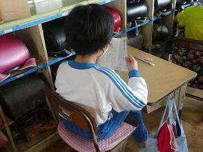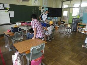 1年生の片づけの様子。まだぎこちないです。 午後の学習。ゆりの木が観察をしていました