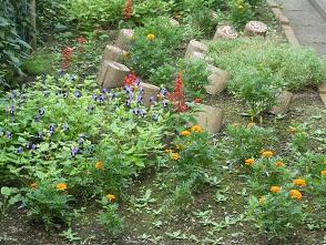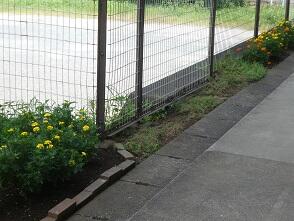 体育館前の花壇。マリーゴールドがきれいです 山田さんが花壇の除草をしていました。感謝以外の言葉がありません。本当にいつもありがとうございます。