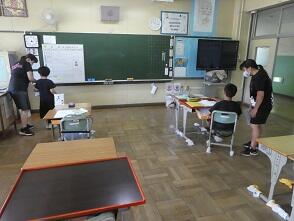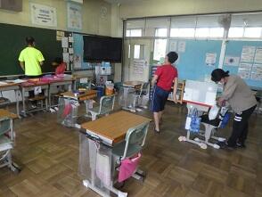 職員が児童の机を拭きます 一人ずつ隣の部屋に取りに行きます