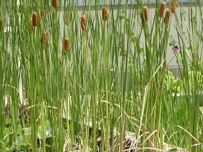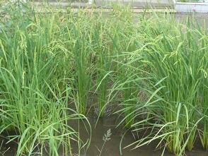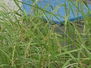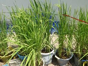 観察池の稲。やっと穂が垂れてきました 一方、近くのバケツ稲。とても生育がよいです