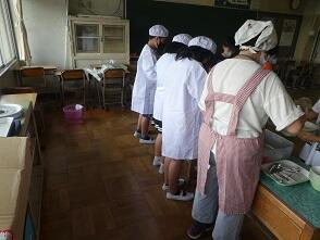 4年生は配膳の最中でした。係の子ががんばります 5年生は配膳が終わり、間もなく食べ始めます