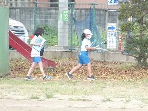 片付けも距離を取り一人ずつ片付けていきます。1年生(左)とゆりの木(右)